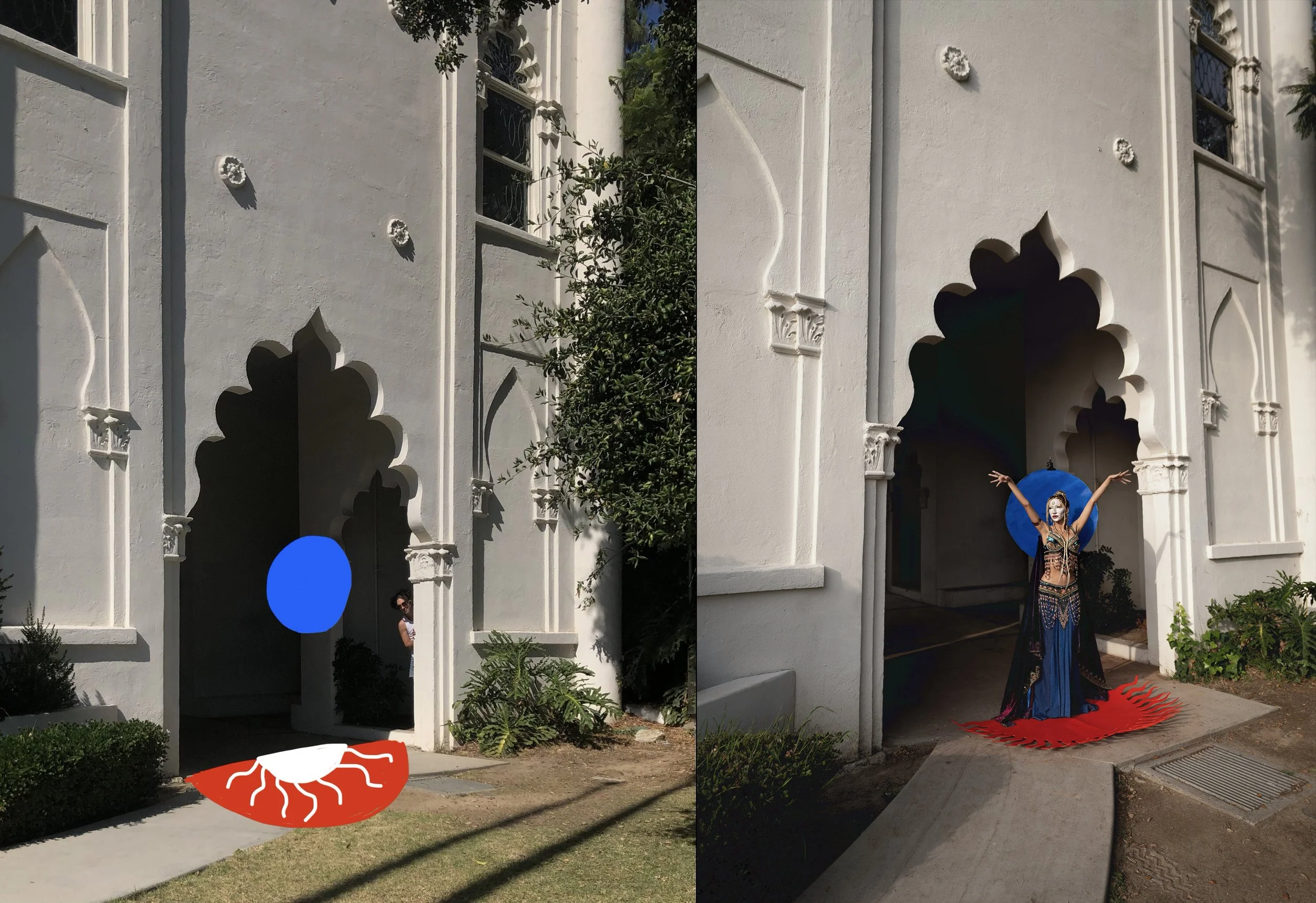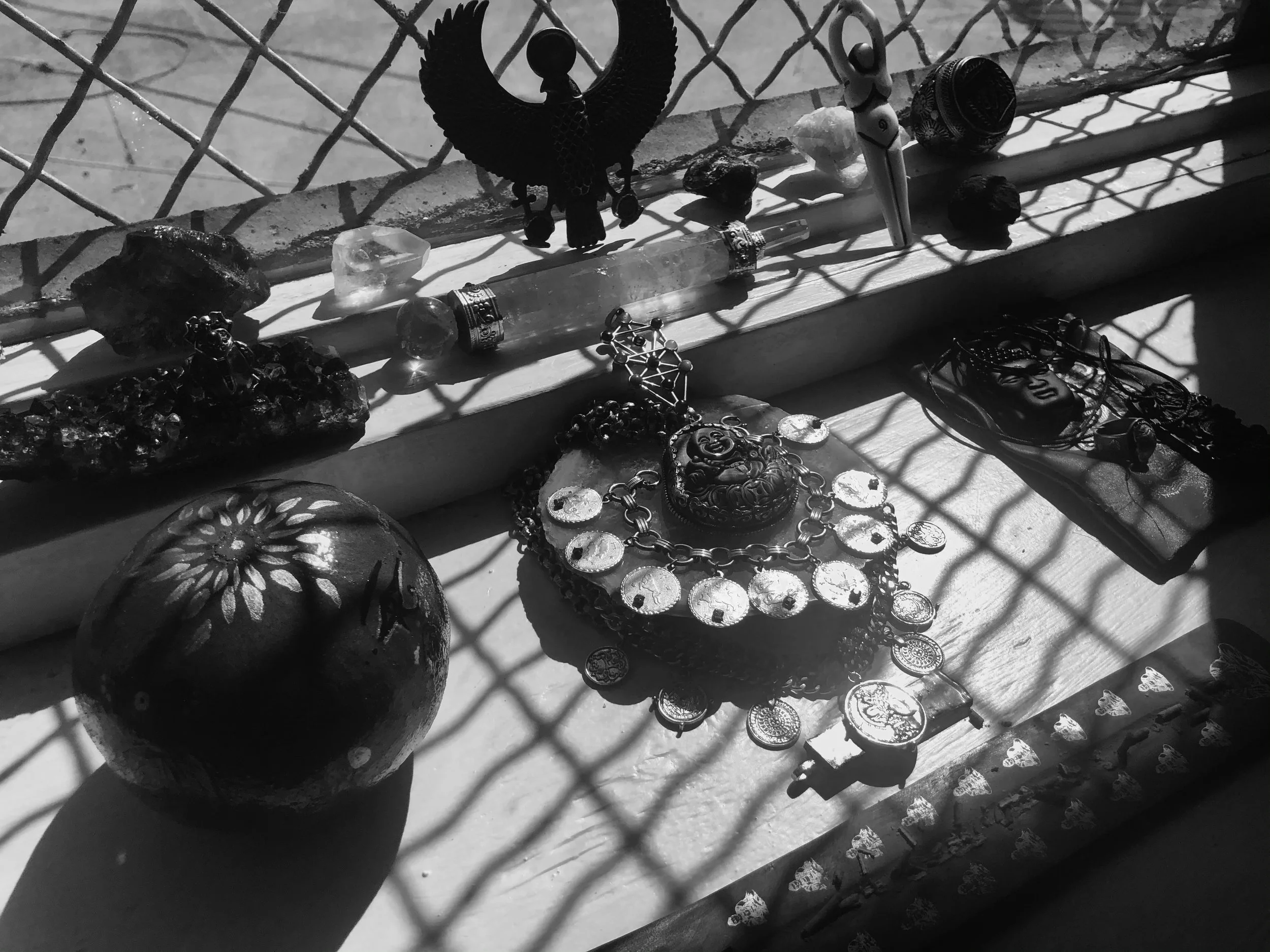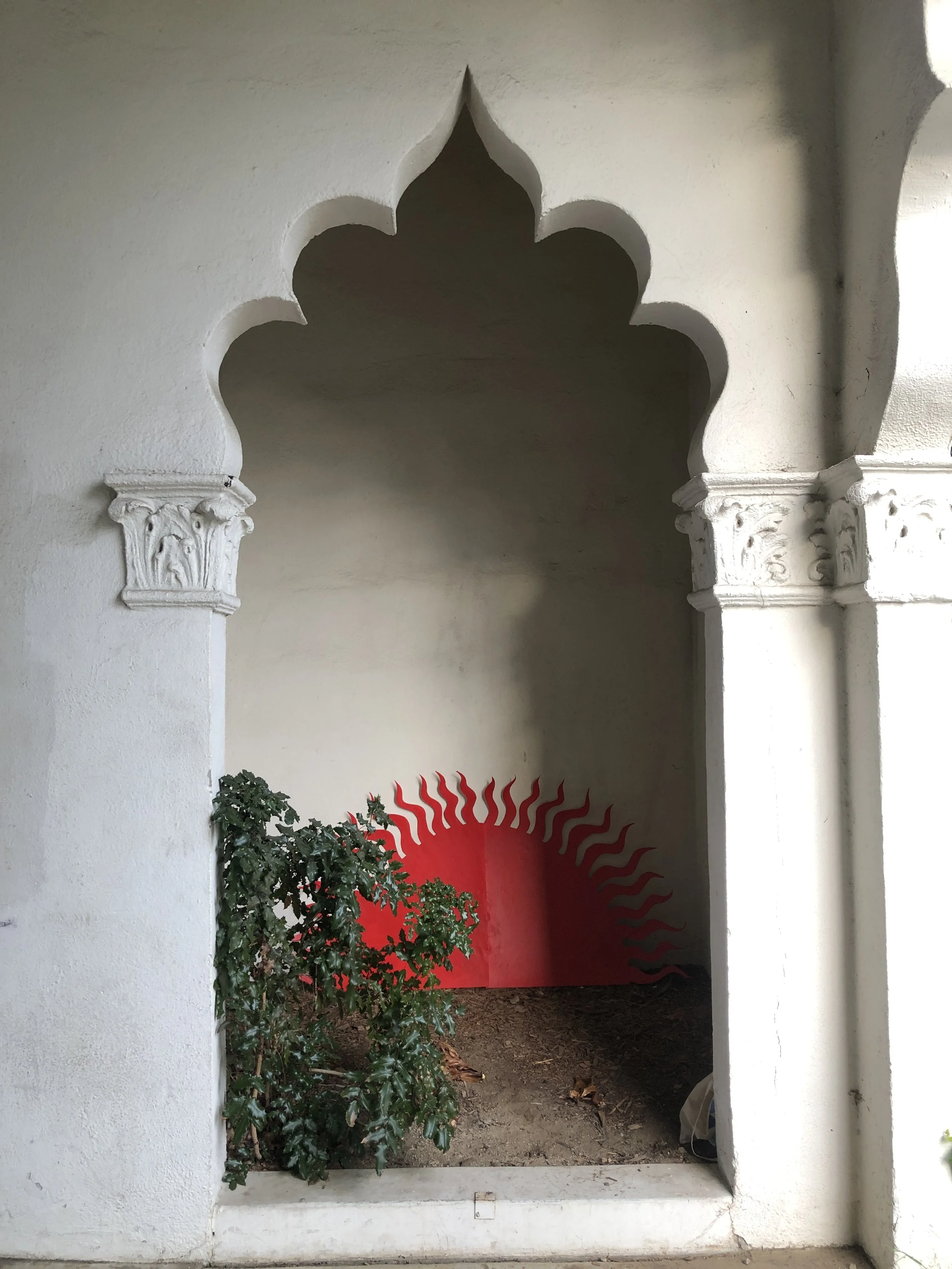 After visiting this beautiful Library in Los Angeles I was immediately inspired to create a series of photographs at this location. The doors reminded me of the portals I love to create when doing rituals, so I decided to create two symbols that would hold energy for me to enter this portal of magic. After taking a few pictures of the door at different angles, a colbat blue and a bright red came to my vision so I drew it quickly as it came on my phone and it given me this. The next step was to make the props and have fun!