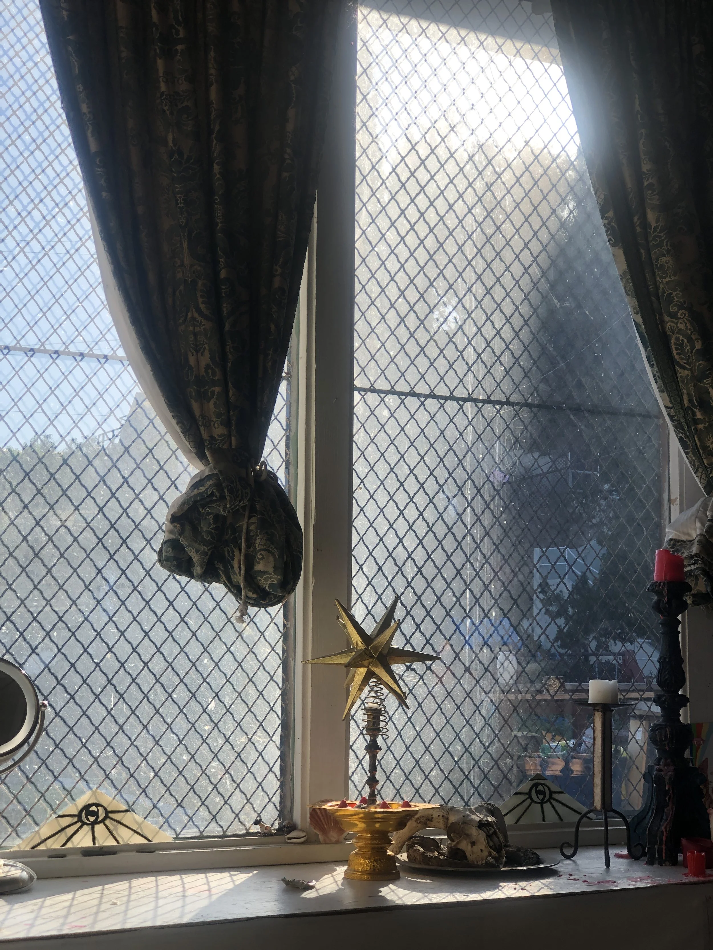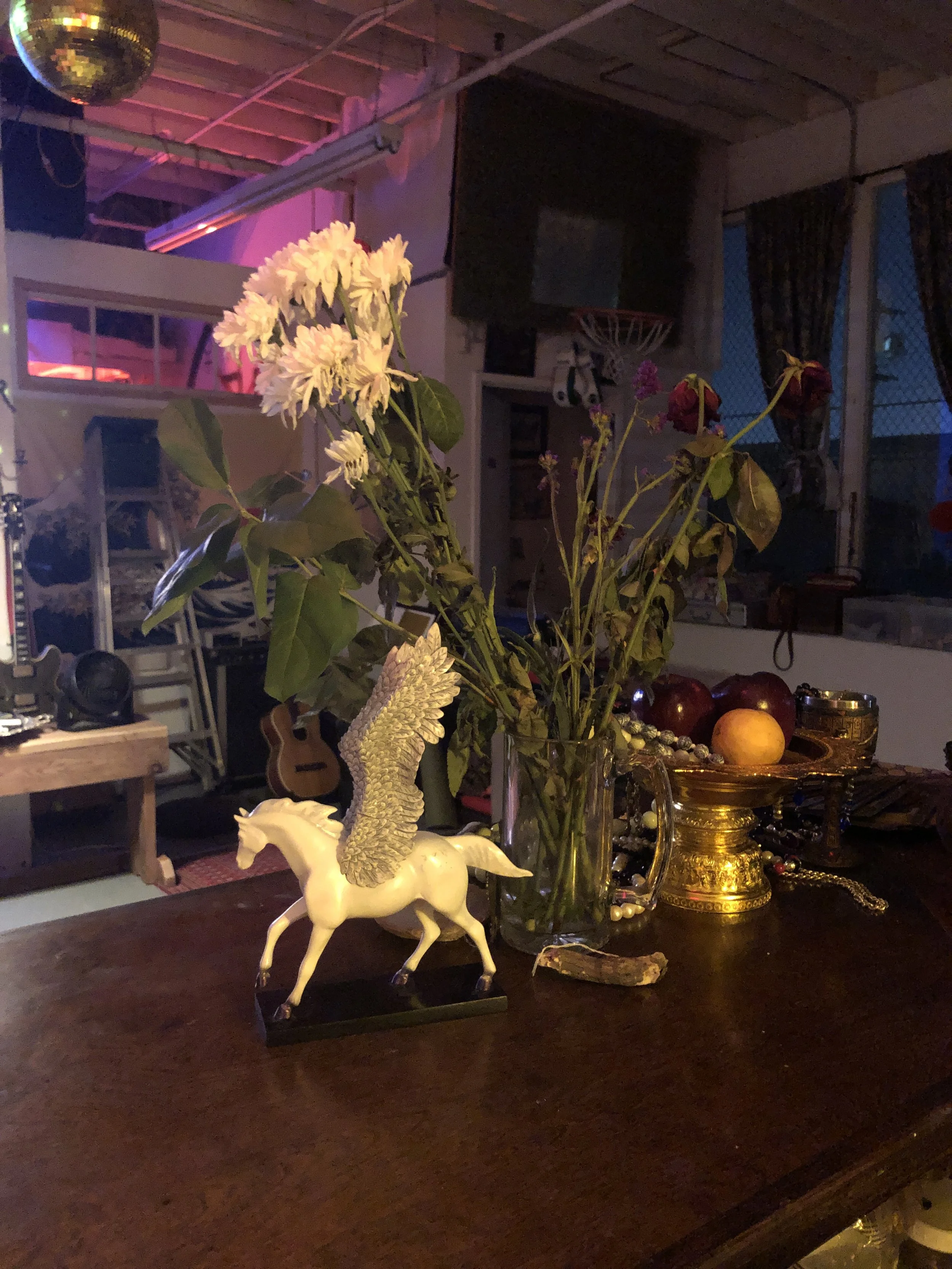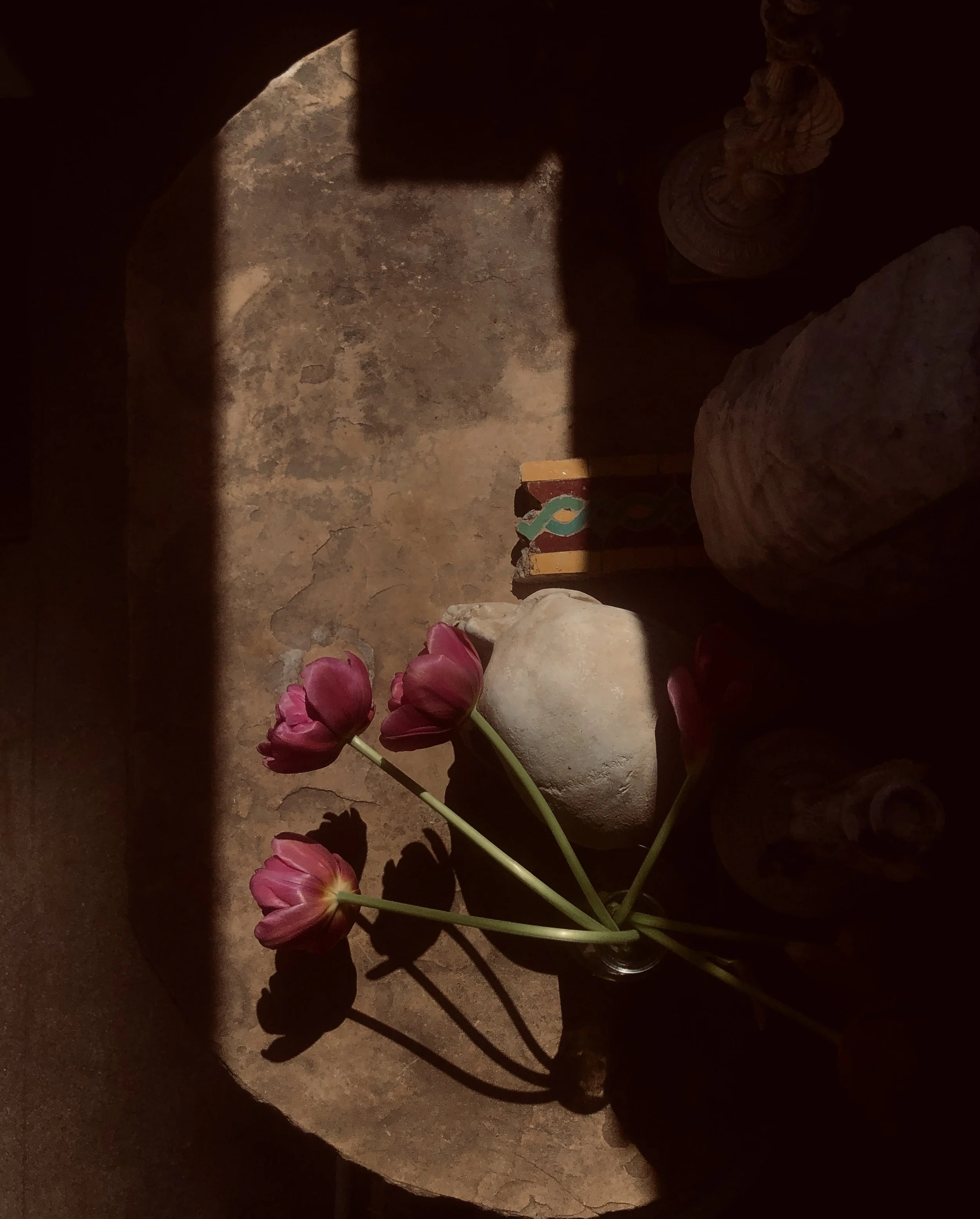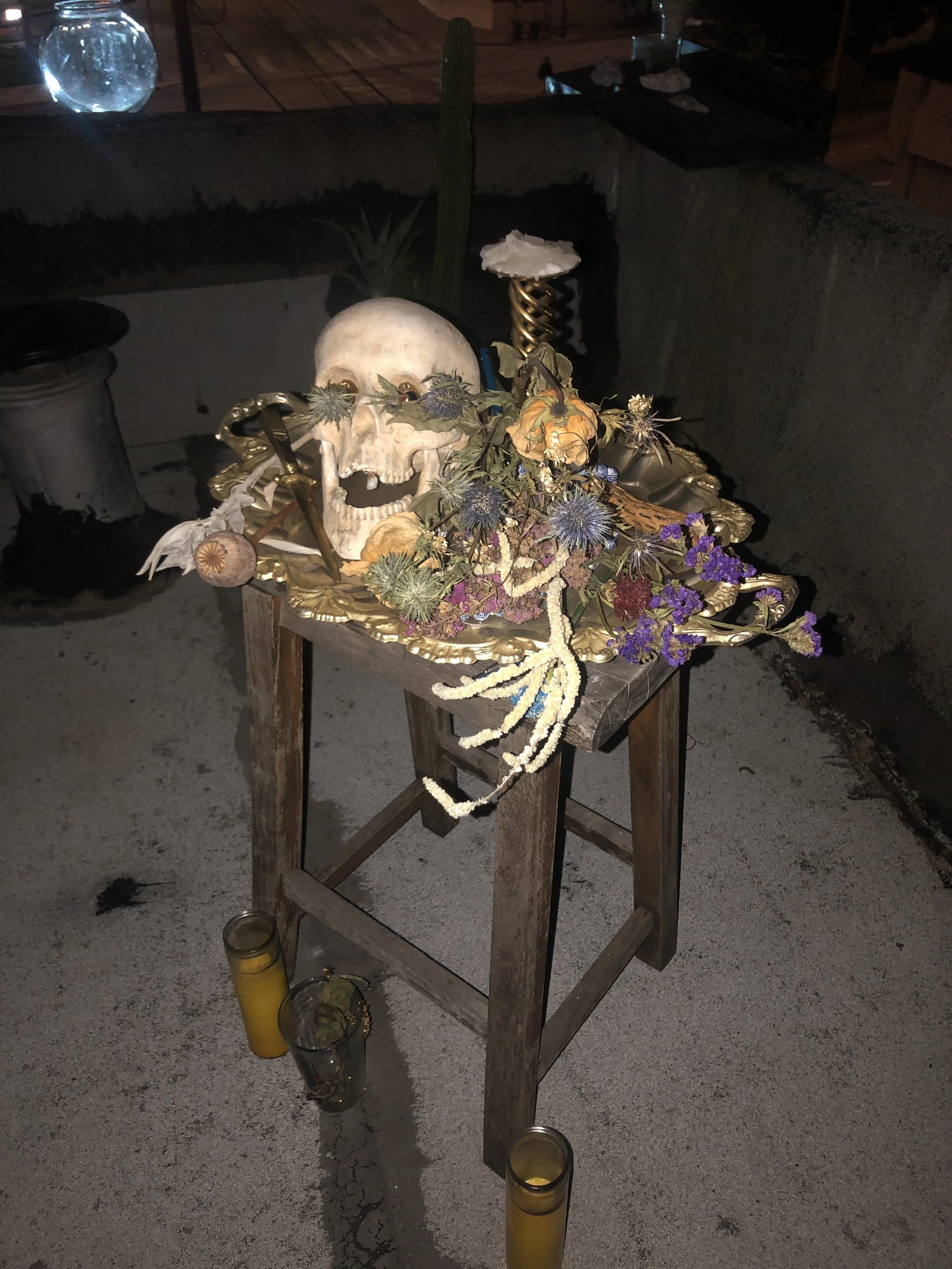 I always had a fascination with skulls and I love to draw them! A few days ago the tulips bloomed and after randomly placing them by the skull, I saw how the silky pink petals and texture of the skull contrasted each other so beautifully. After waiting for the light to hit the table, I was able to capture this harmony between Life & Death. Here some pictures of Altars I have made in my space.