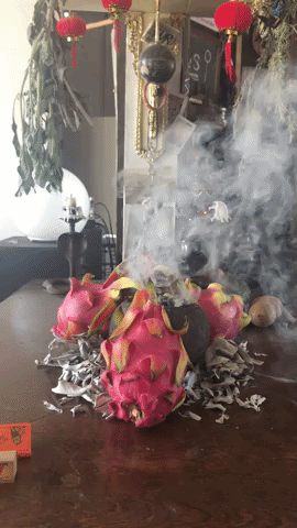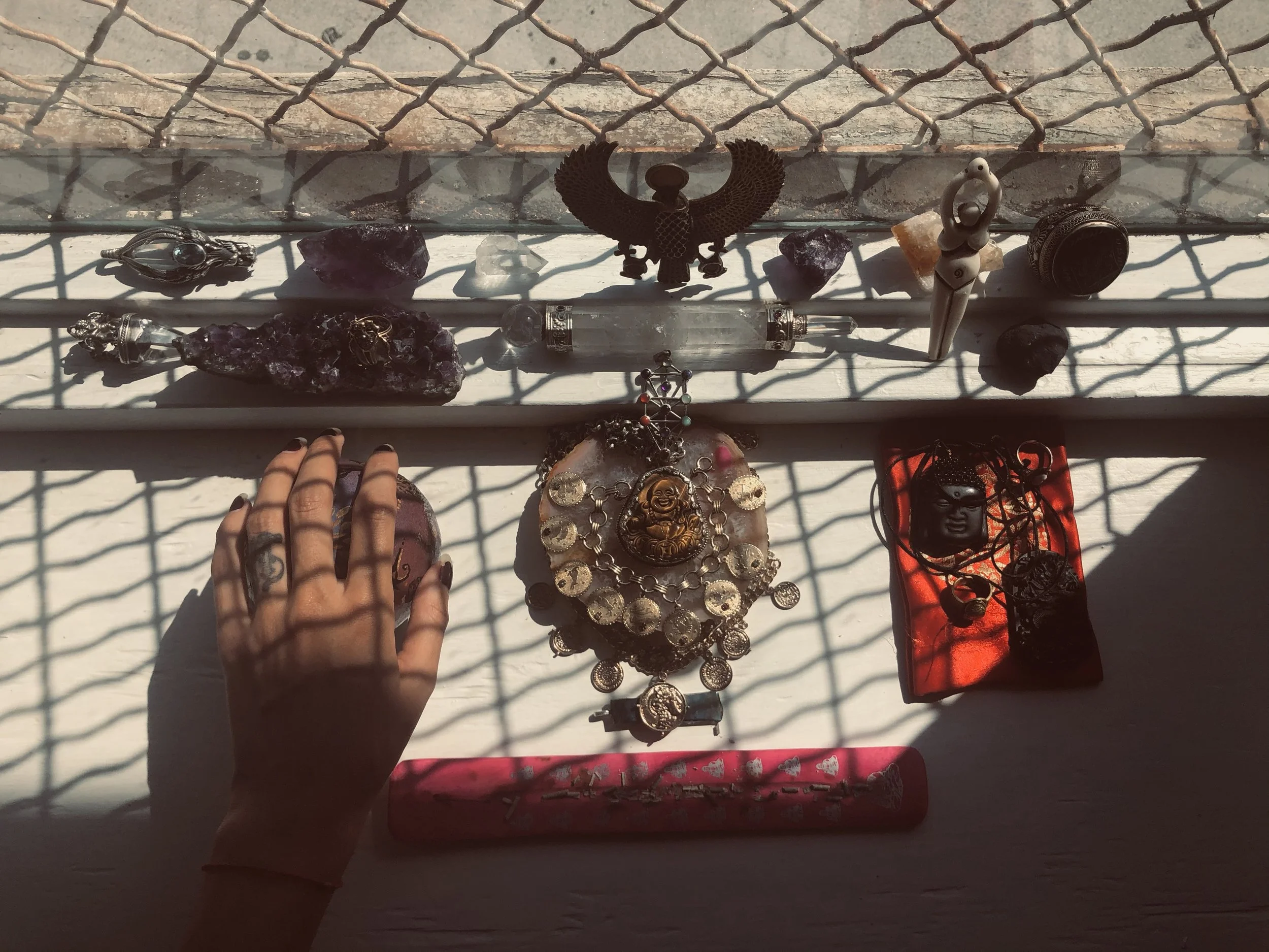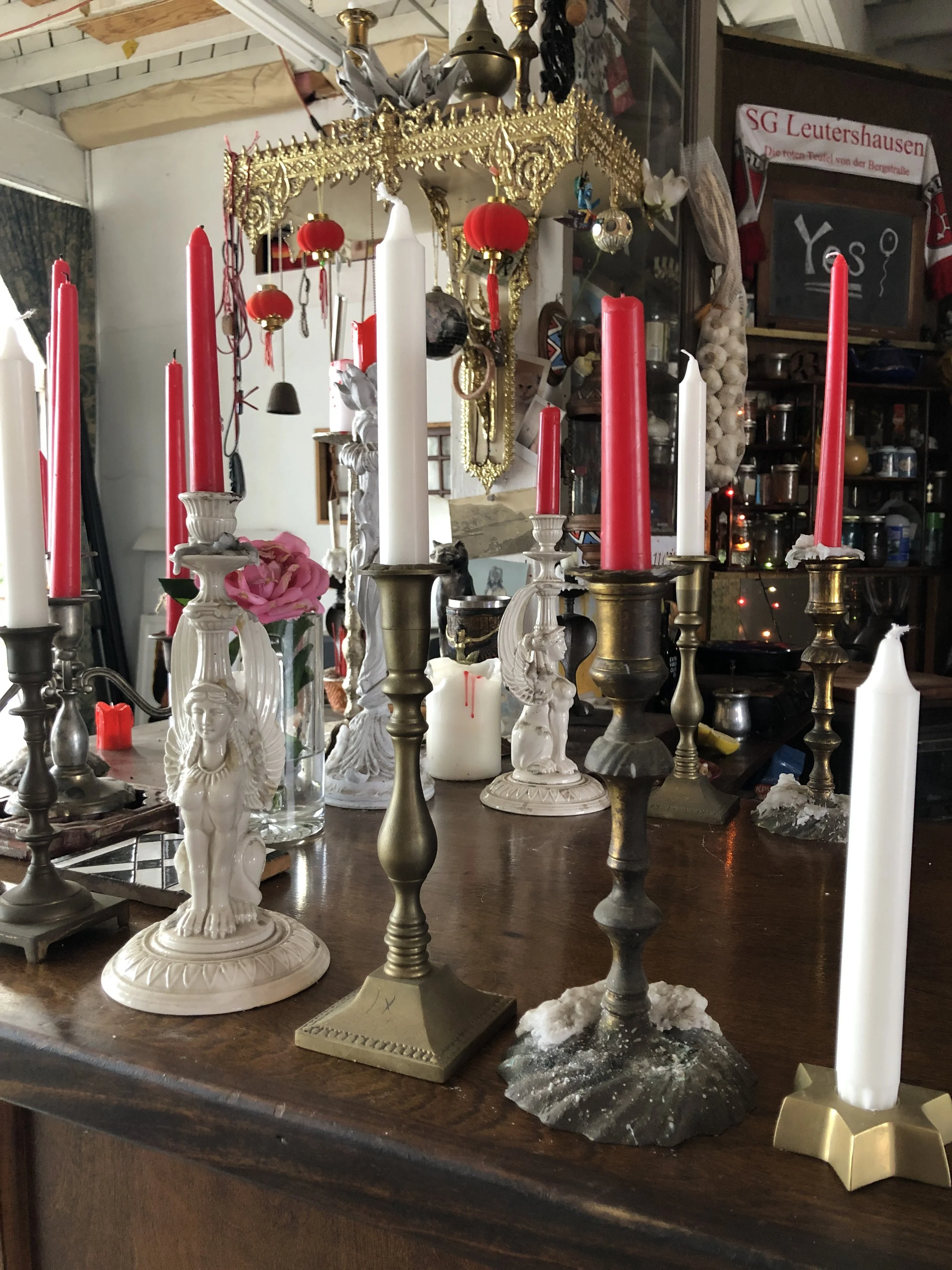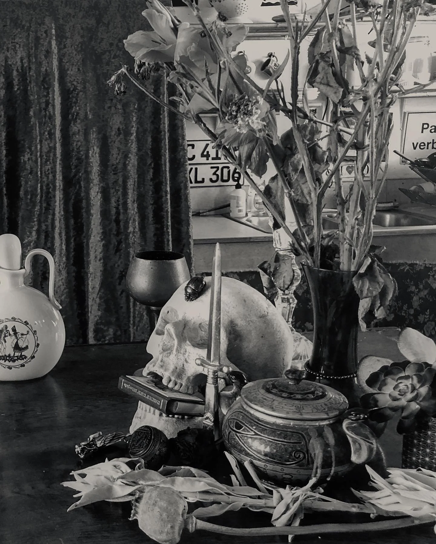 I always had a fascination with skulls and I love to draw them! A few days ago the tulips bloomed and after randomly placing them by the skull, I saw how the silky pink petals and texture of the skull contrasted each other so beautifully. After waiting for the light to hit the table, I was able to capture this harmony between Life & Death. Here some pictures of Altars I have made in my space.